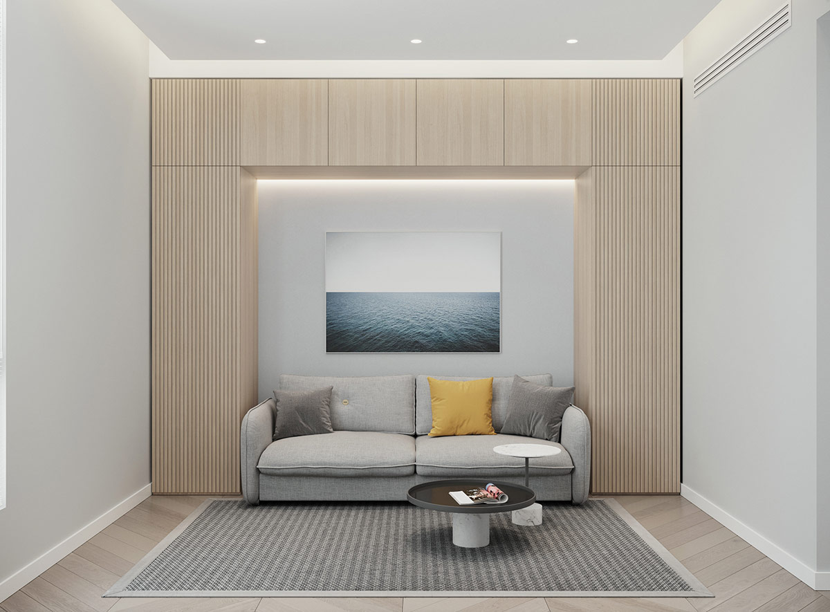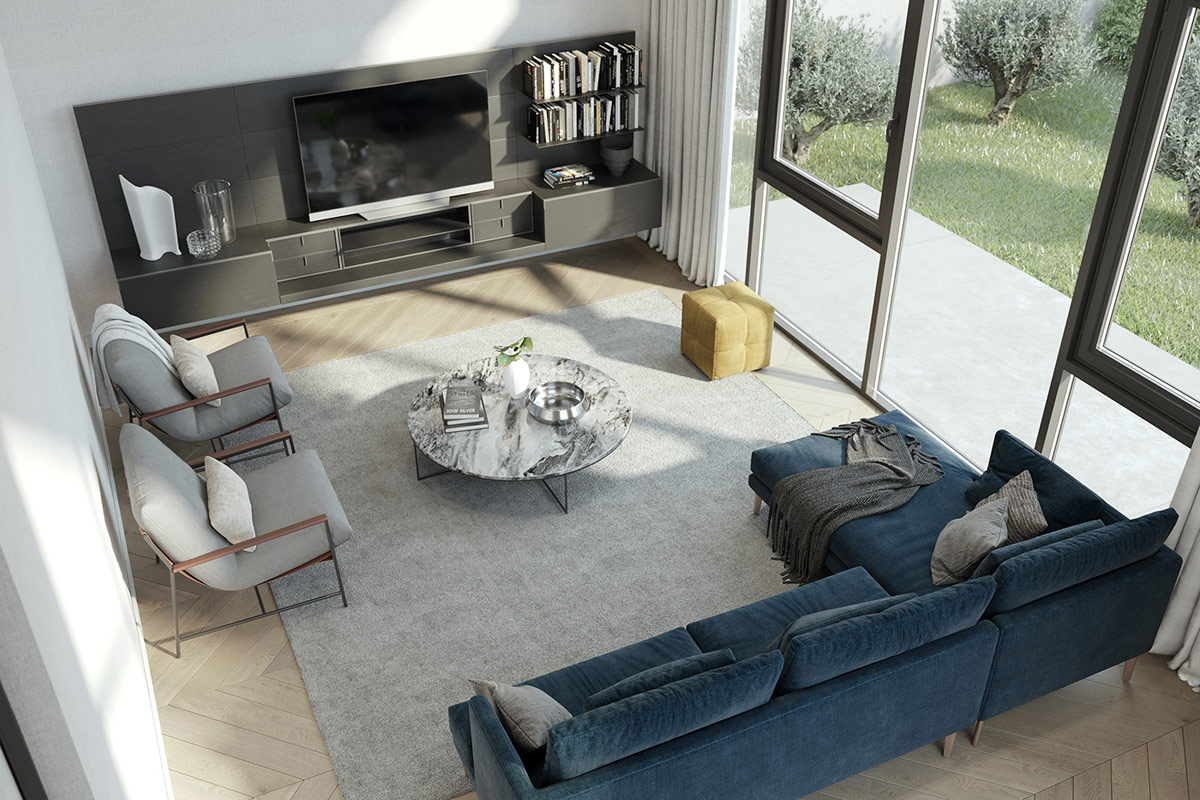 В уютной комнате с телевизором стоит плюшевый синий диван, который придает нейтральной серо-белой цветовой гамме красочный всплеск. Небольшой пуф желтой охры добавляет небольшой момент смелого контраста.