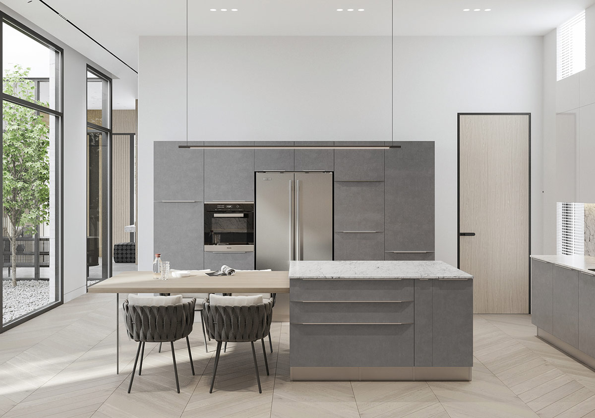 В доме есть вторая обеденная зона, которая составляет часть роскошной кухни. Четыре дизайнерских обеденных стула подъезжают к удлиненному квадратному обеденному столу, прикрепленному к кухонному острову. Бледно-серые блоки украшают остальную часть большого пространства в форме буквы L.