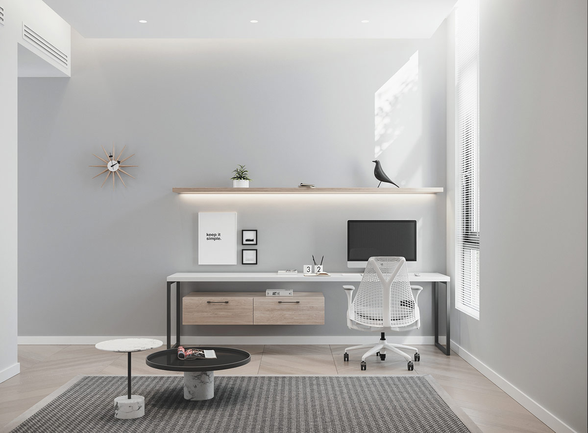 Солнечные лучи современных часов середины века возвышаются рядом со стильным современным дизайном стола, под которым расположен набор плавающих ящиков. Птица Имса живет на настенной полке над монитором компьютера, на нижней стороне которого находится лента светодиодной подсветки.