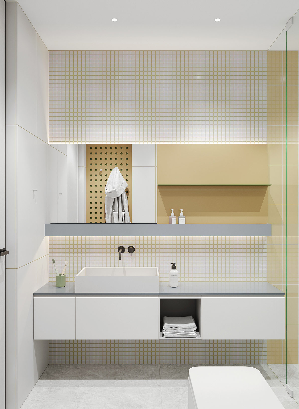 Детская ванная украшена более забавными желтыми штрихами, которые обязательно заставят их проснуться и зарядиться энергией для школы.