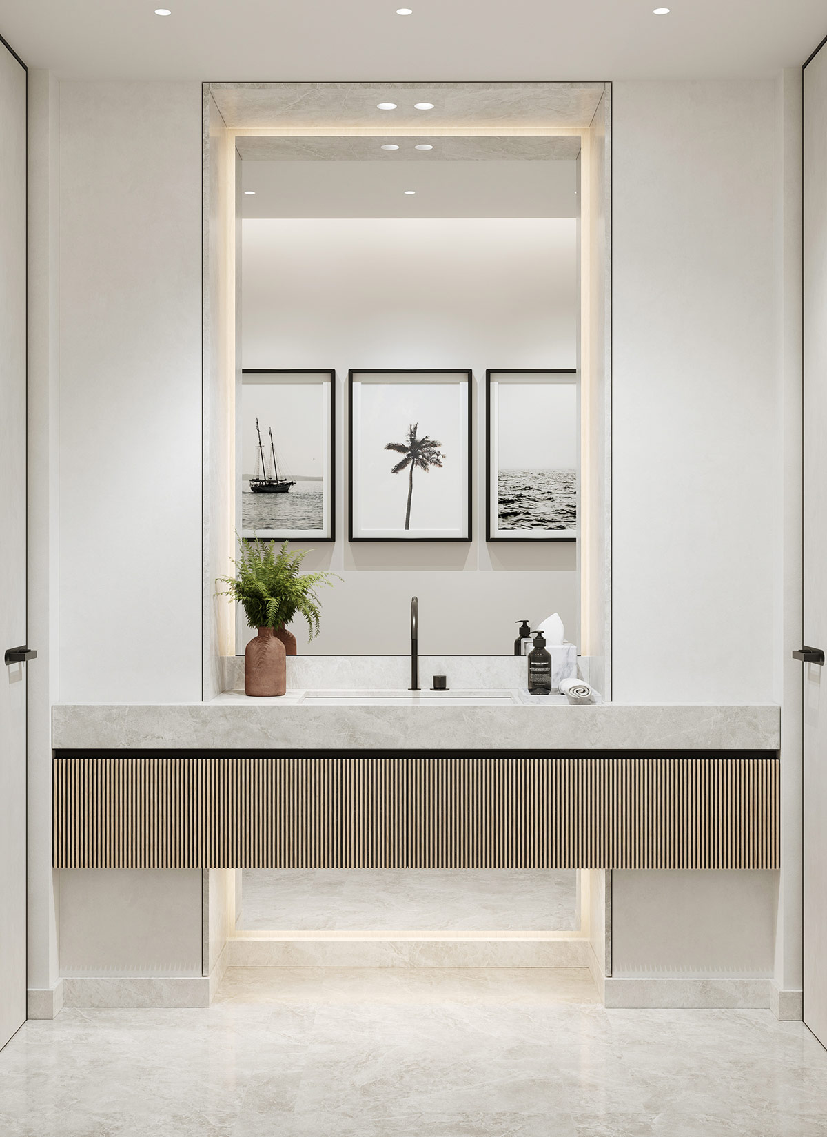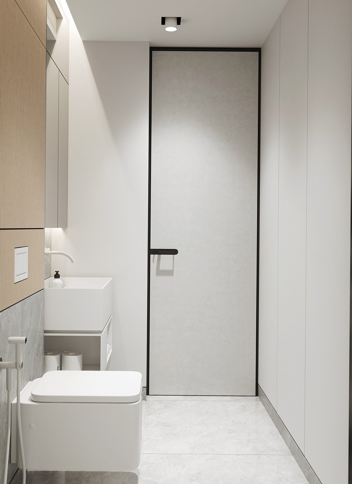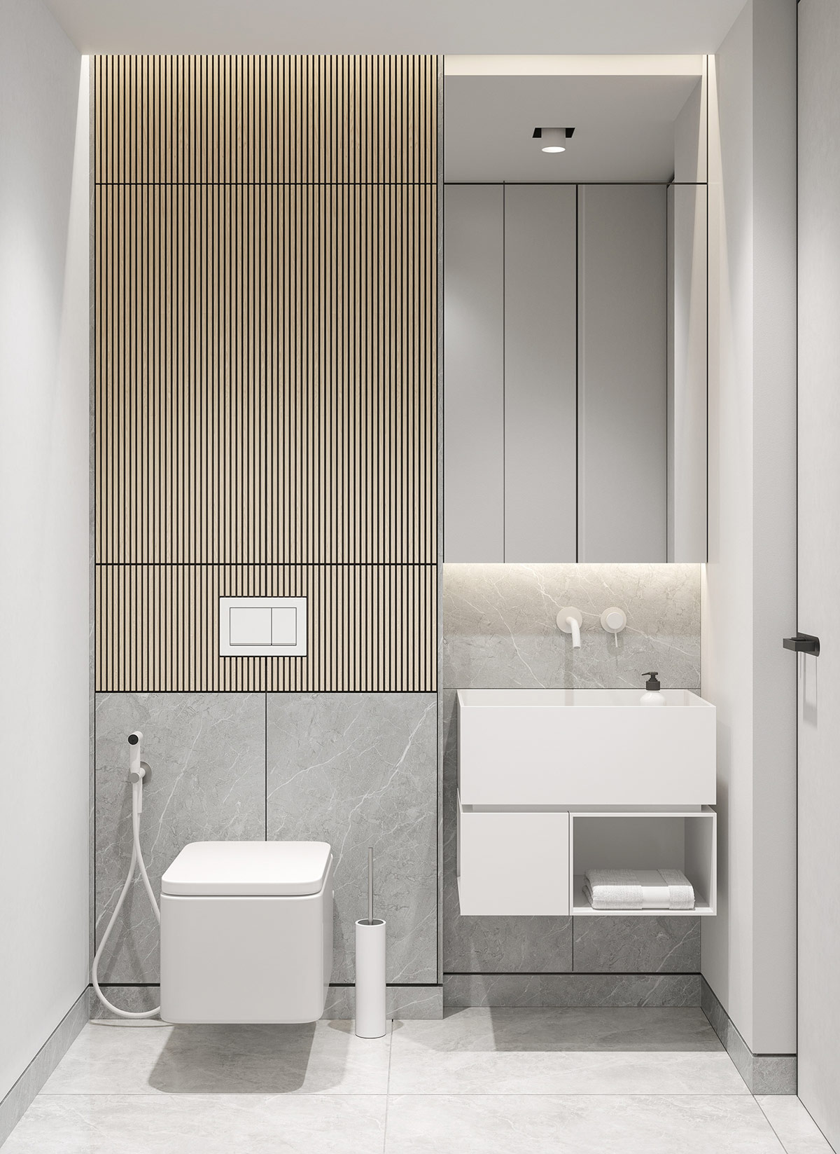 Небольшой примыкающий к спальне туалет был украшен продолжением деревянной планчатой отделки главной спальни, а также шикарной мраморной серой плиткой.