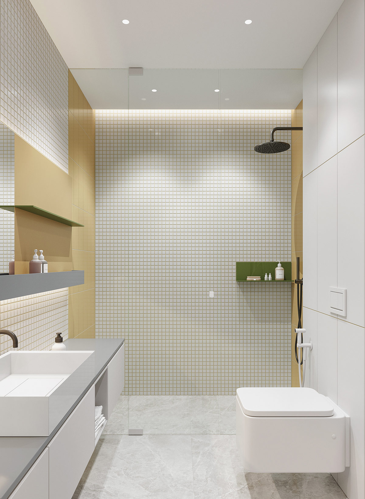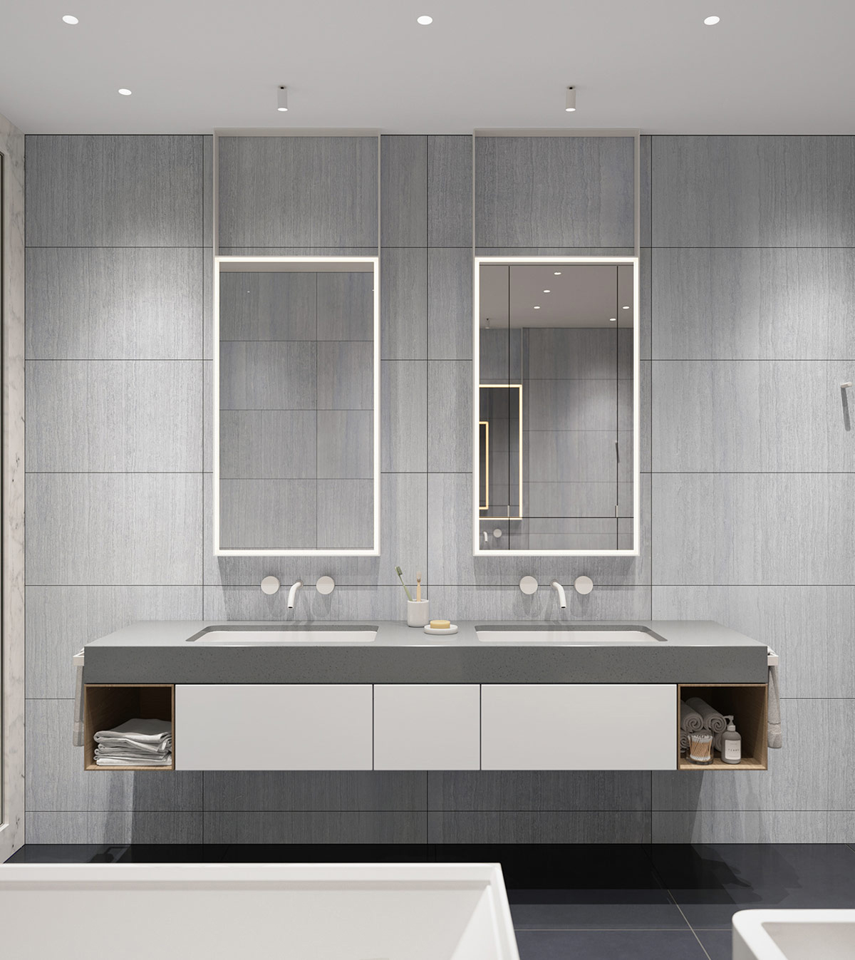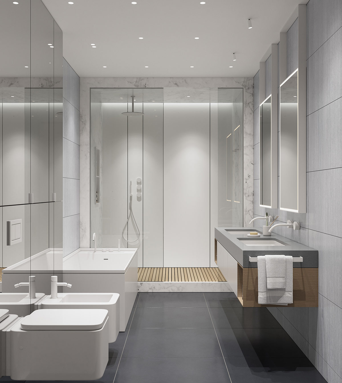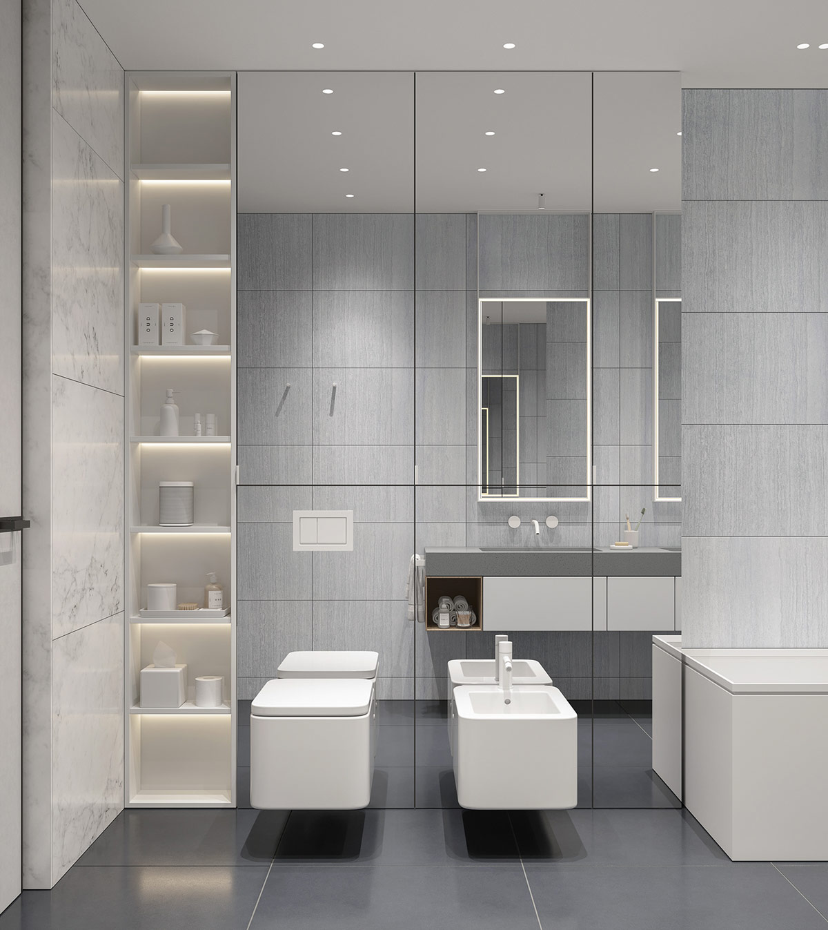 Подвесной унитаз и биде установлены на зеркальные панели, что значительно увеличивает ощущение пространства и света в ванной комнате. Башня из утопленных стеллажей имеет подсветку как декоративную и практичную функцию.