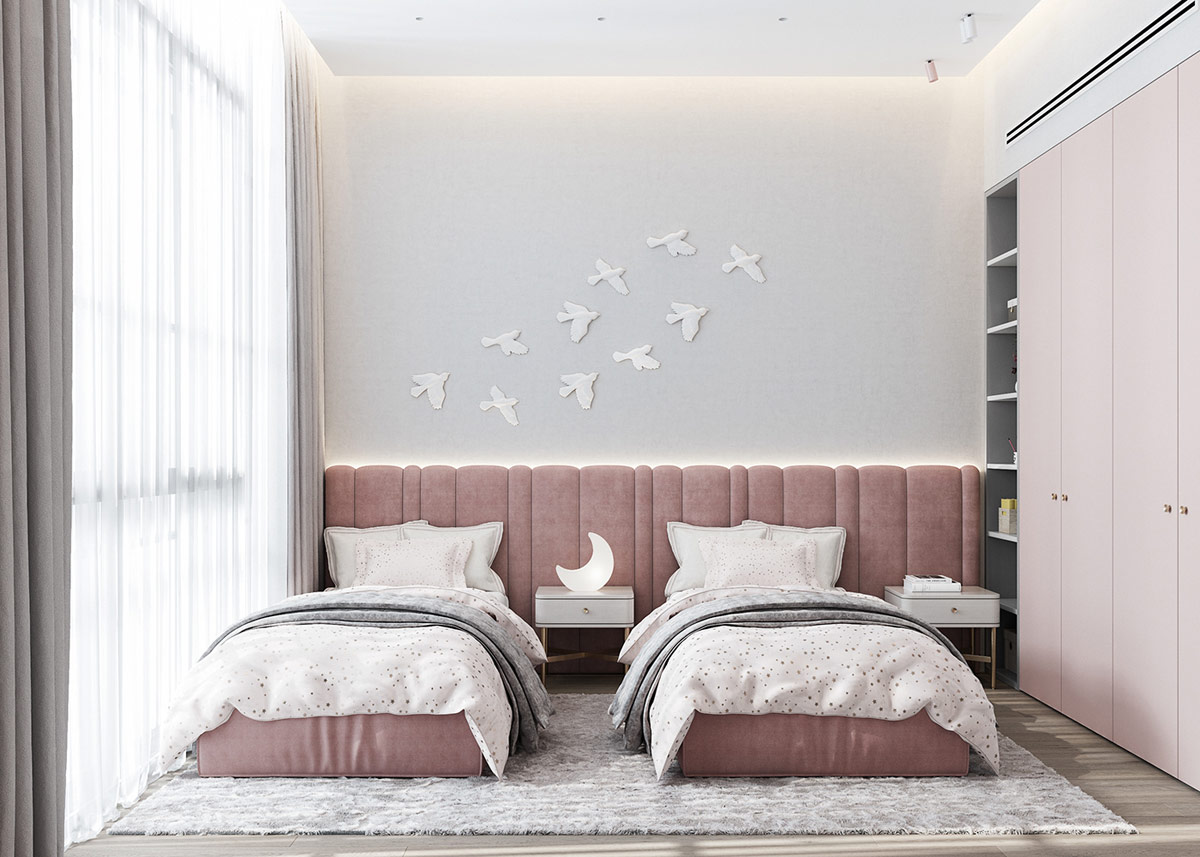 Эта общая розовая спальня представляет собой причудливое пространство, где стая птиц парит над сияющей луной.