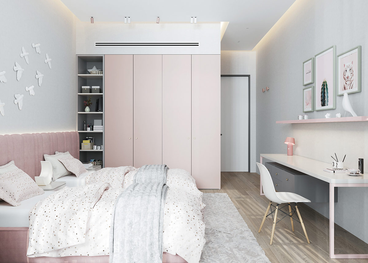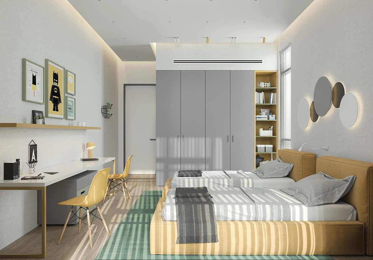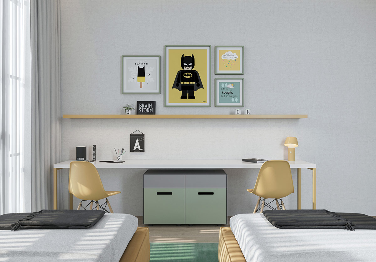 У изножья двухъярусных кроватей на всю ширину комнаты простирается двойное рабочее место. Ящики стола расположены в мертвой точке, чтобы равномерно разделить пространство, а общая полка использует пространство стены. Картины супергероев и вдохновляющие цитаты станут прекрасным украшением для детей.