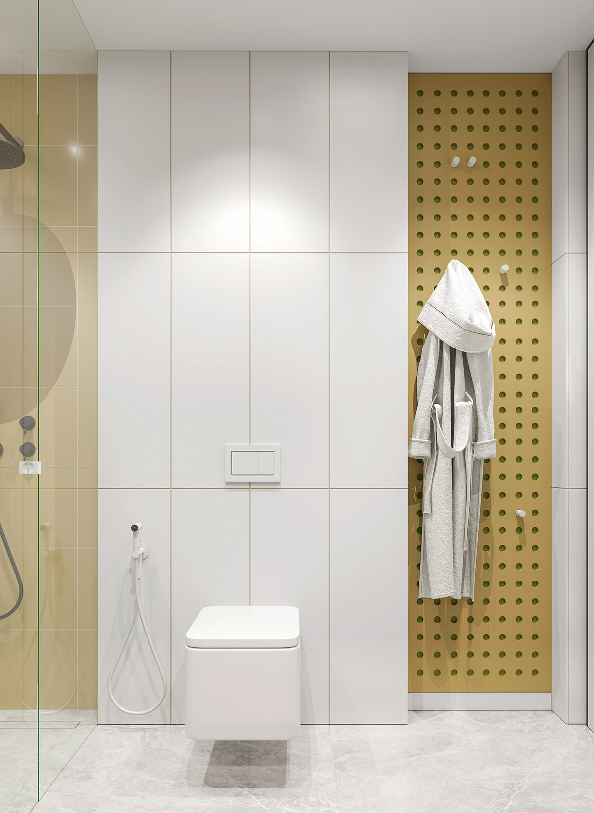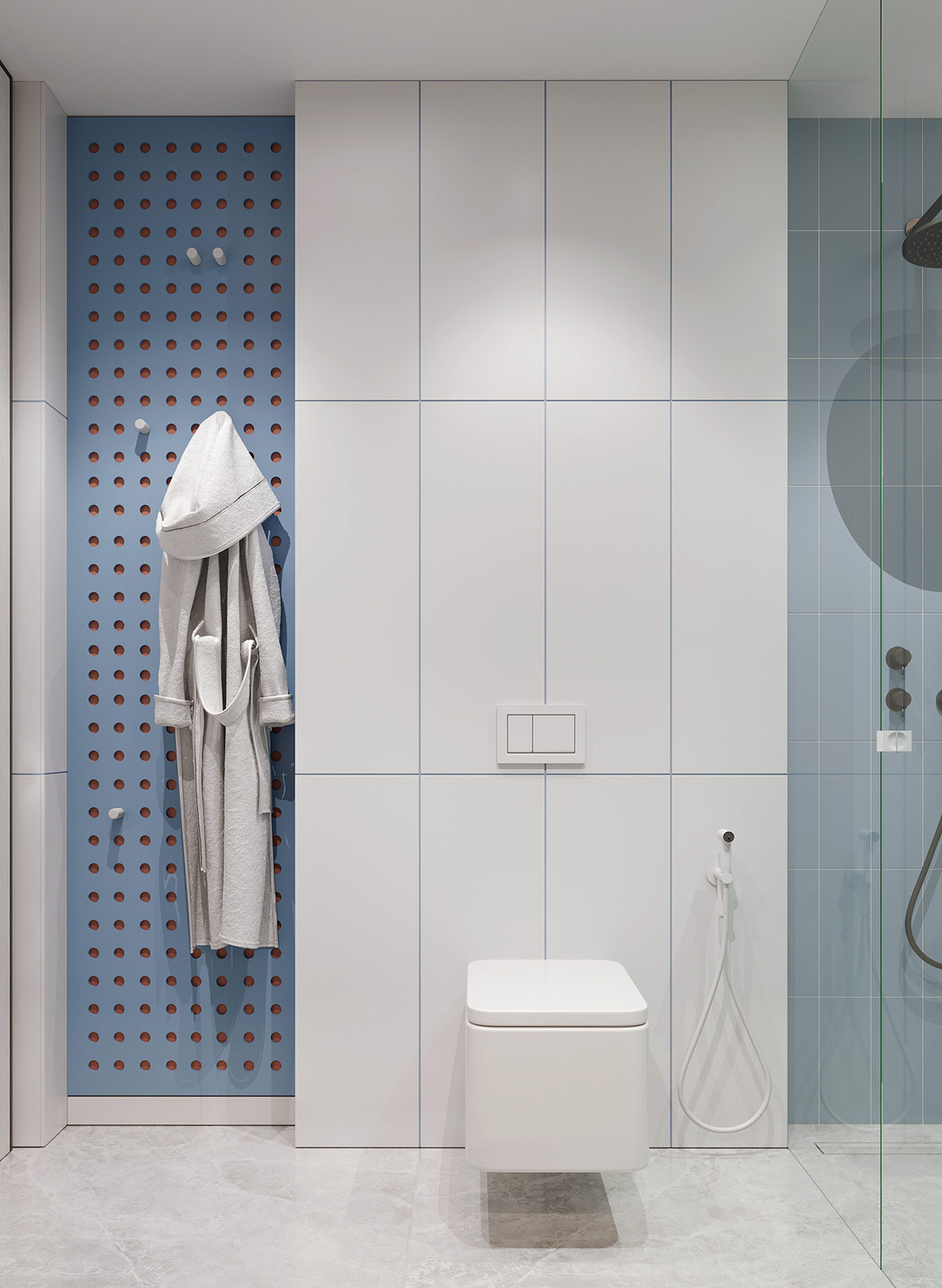 Стена из перфорированной доски — практичный выбор для детской ванной комнаты, потому что подвижные крючки для халатов можно регулировать по высоте по мере роста детей.