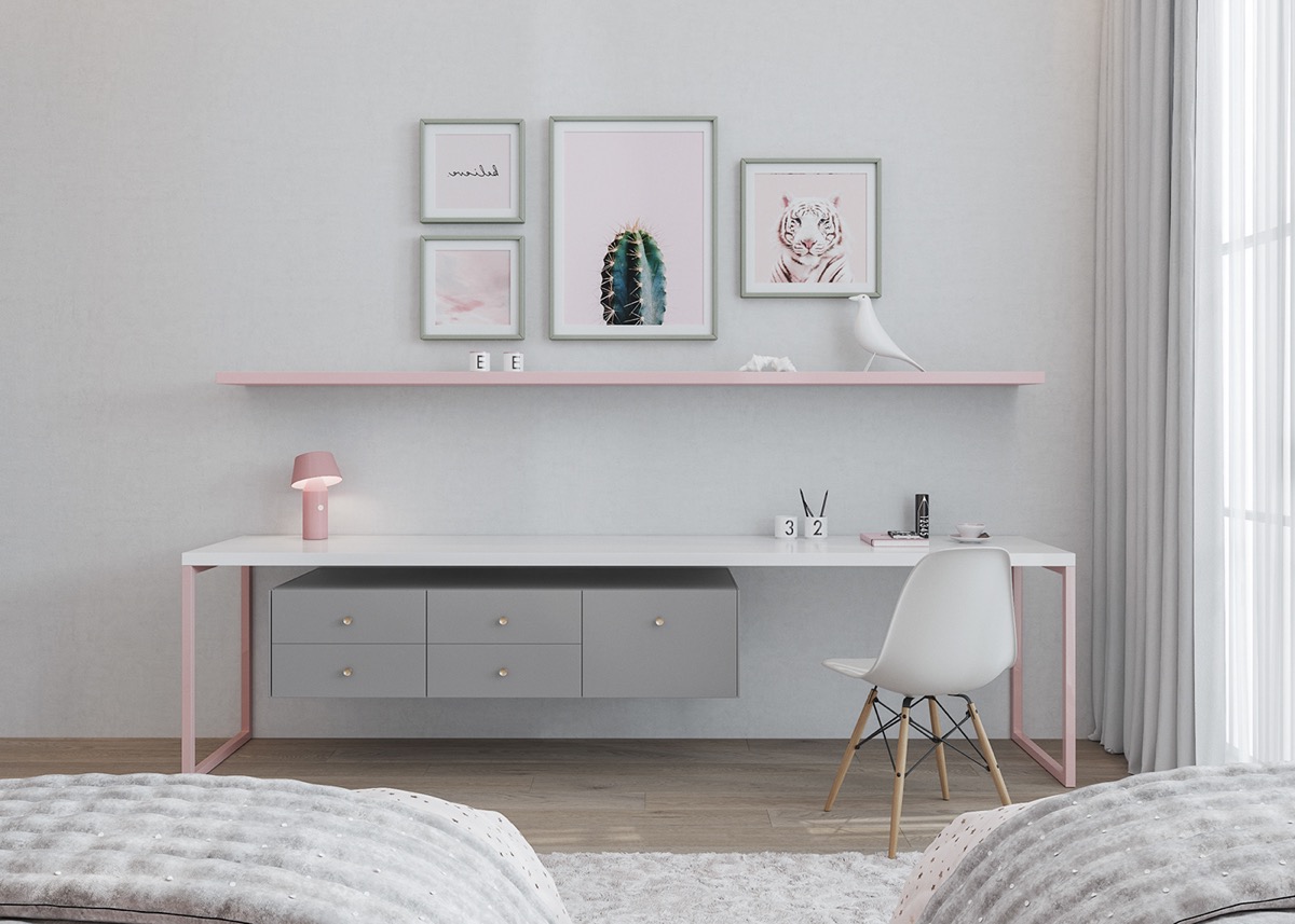 Розовые художественные принты, розовая настенная полка и розовая настольная лампа дополняют розово-белый детский стол.