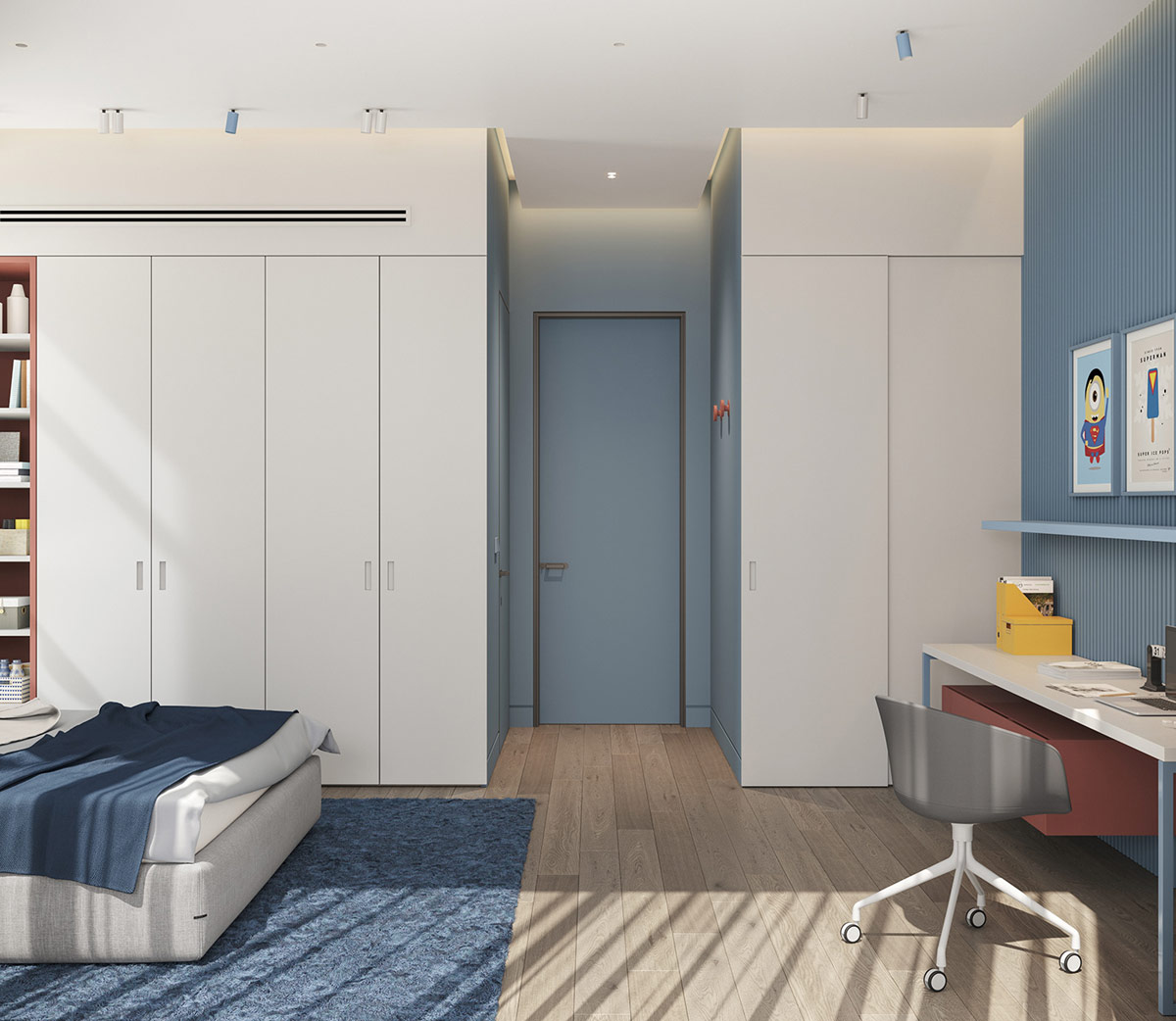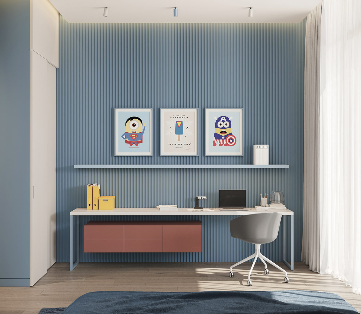 Синие рейки создают выразительную стену за рабочим местом ребенка. Серое вращающееся кресло станет прохладным дополнением, а коричневый выдвижной ящик принесет землистую теплоту.