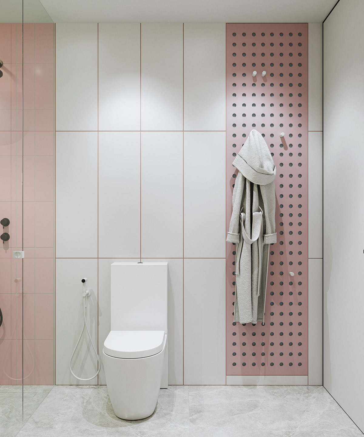 Розовая стена из перфорированной доски — еще одна отличная вешалка для халатов в ванной.