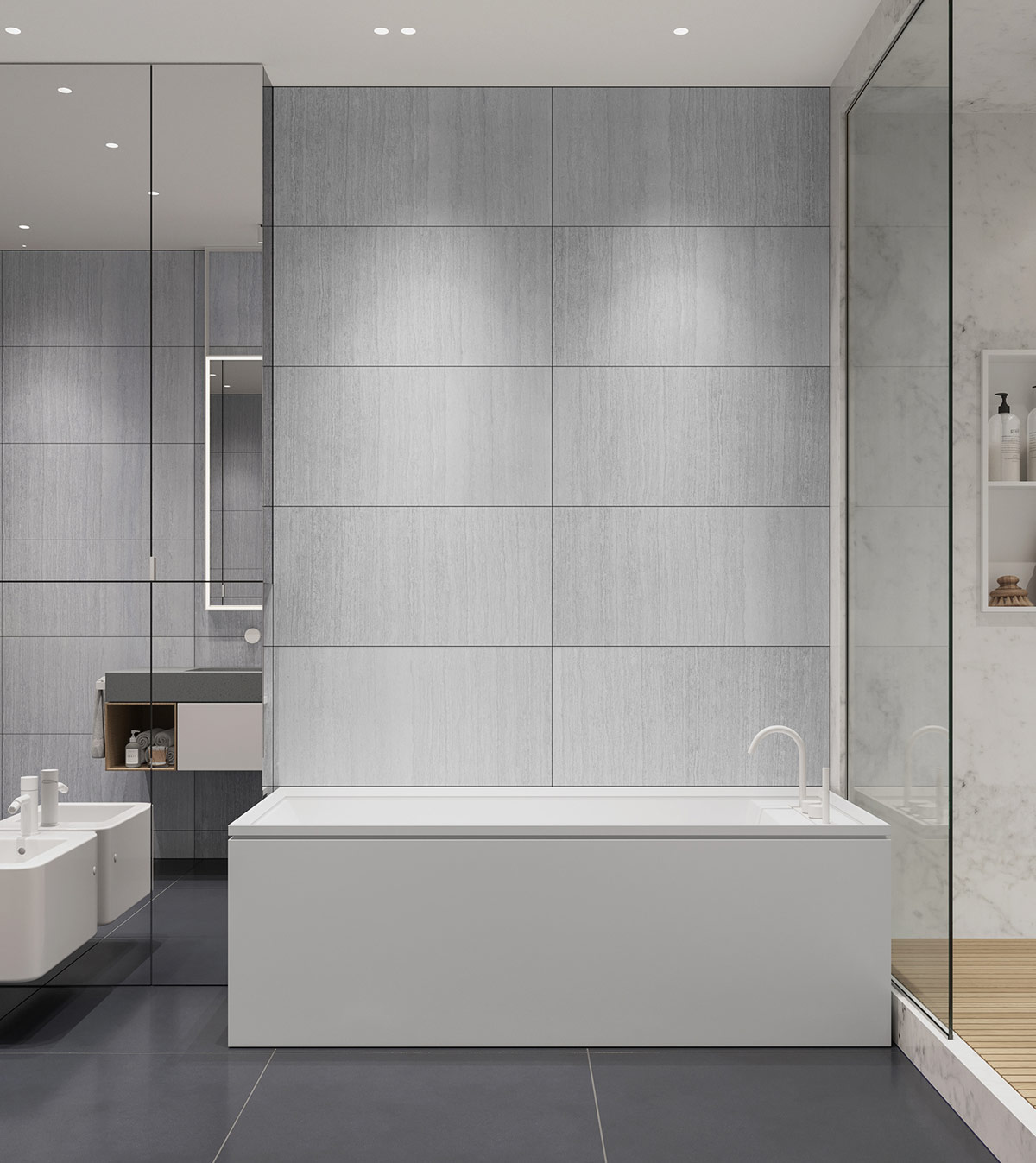 Крупные горизонтальные плитки подчеркивают линейный профиль ванны.