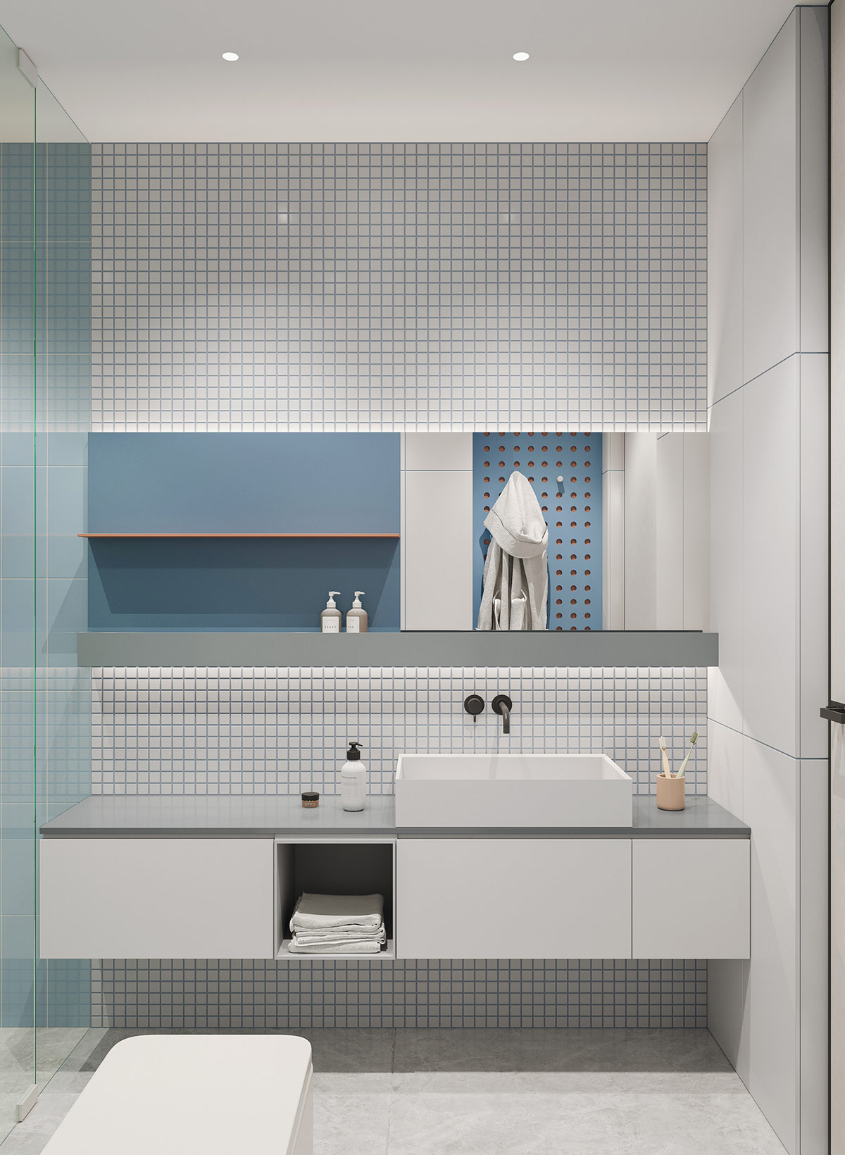 Синие и розовые акценты создают приятный контраст в ванной комнате.
